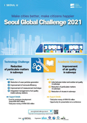 Seoul, Korea - Seoul Metropolitan Government and Seoul Business Agency (SBA, CEO Jang Young-seung), an institution that supports small and medium-sized companies in Seoul, announced the opening of the 'Seoul Global Challenge 2021', a global contest for innovative technologies and ideas to reduce particulate matters and improve air quality in subways', which will begin on October 14, 2020.