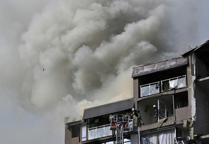 The top three floors of a building in the Shevchenkivsky neighbourhood were completely destroyed and several fires broke out, spewing thick smoke.