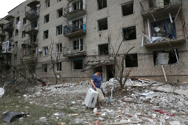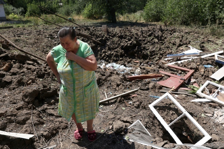 In Chasiv Yar, which was hit by a strike on July 10 in which more than 45 people were killed, a 64-year-old woman gathered apricots in a scene of devastation in front of the destroyed building.