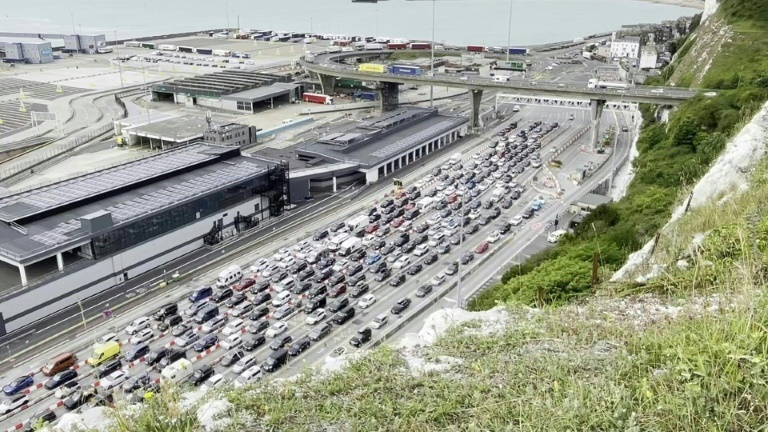 Aerial footage of the port showed around eight lanes of slow-moving traffic backed up for about 300 metres, while other images posted online showed cars queued back into the town of Dover and long lines of lorries on a nearby motorway.
