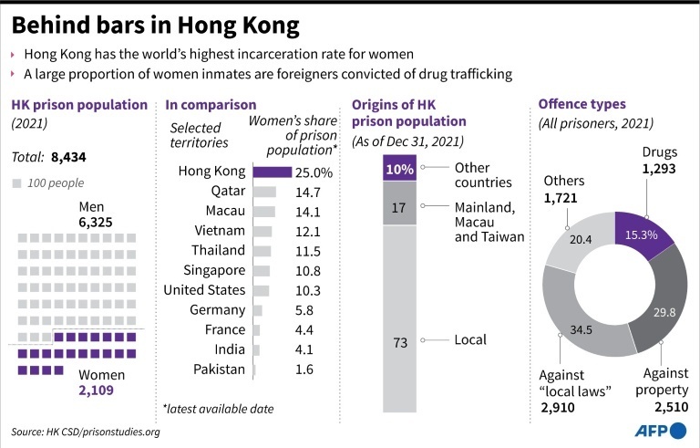 Official statistics show that a quarter of the 8,434 people serving time in Hong Kong last year were women -- the highest rate globally, according to the World Prison Brief.