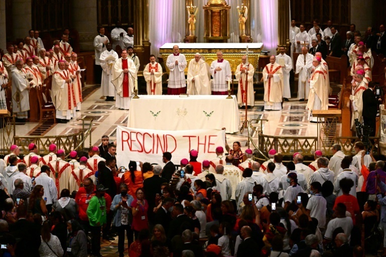 Inside the shrine, just in front of the altar and a few feet away from Francis as mass began, demonstrators unfurled a sign which read: "Rescind the doctrine" -- referring to the Doctrine of Discovery, the 15th century papal edicts that empowered European powers to colonize non-Christian lands and people.