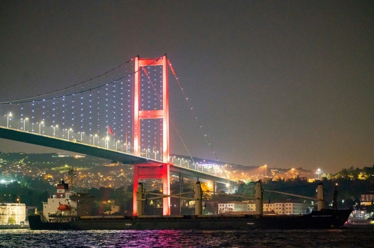 The first wartime shipment of UN food aid for Africa reached the Bosphorus Strait on Wednesday carrying 23,000 tonnes of wheat.