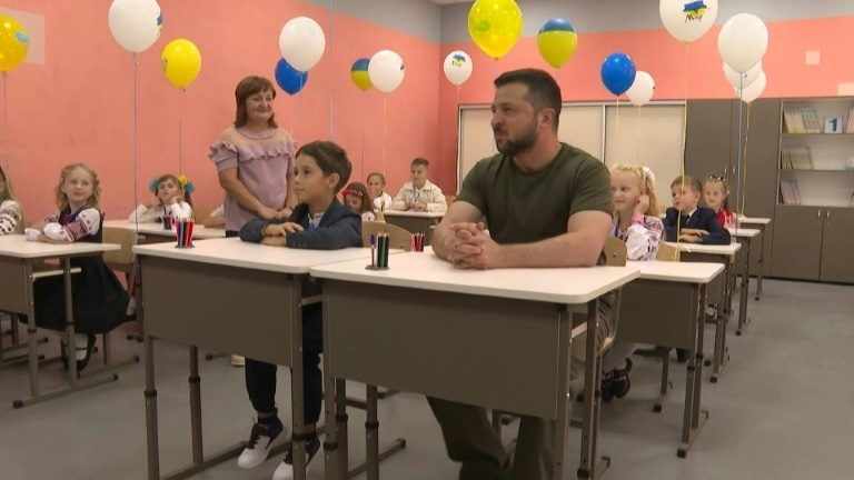 But with lessons taking place at home to the background sound of gunfire and shelling, this is no ordinary first day back at school for the nine-year-old Ukrainian.
