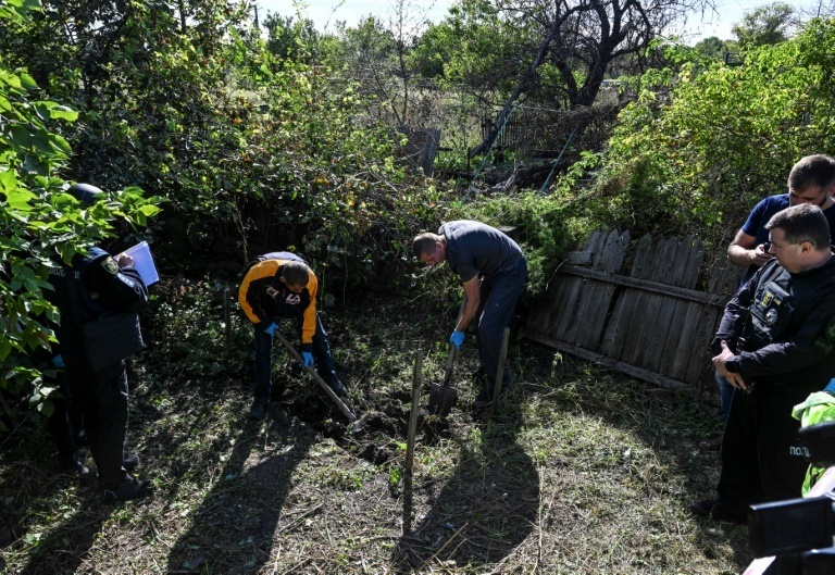 In the village, police and a team from the Kharkiv region's prosecutors office exhume the bodies of two men aged in their thirties.