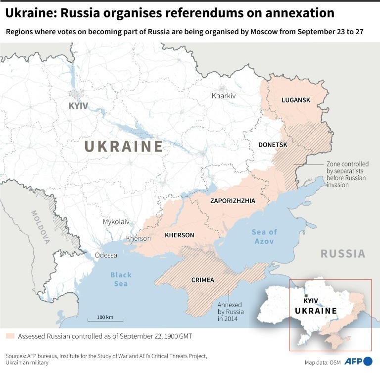 The four Russian-occupied regions of Ukraine -- Donetsk and Lugansk in the east and Kherson and Zaporizhzhia in the south -- announced that they would hold the votes just days before voting began on Friday.