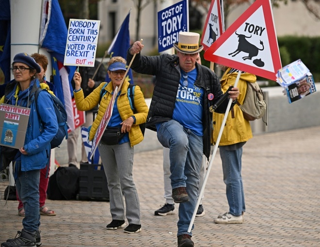 Protesters outside the British Conservative party's annual conference added an air of musical farce after the new government's signature economic policy was left in tatters Monday.