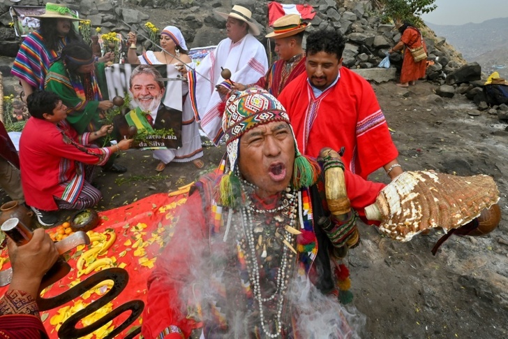 Atop a sacred hill in Lima, Peruvian shamans scatter coca leaves and flower petals while a snake named Maria slithers over posters of world leaders including Russia's Vladimir Putin and Brazilian president-elect Luiz Inacio Lula da Silva.