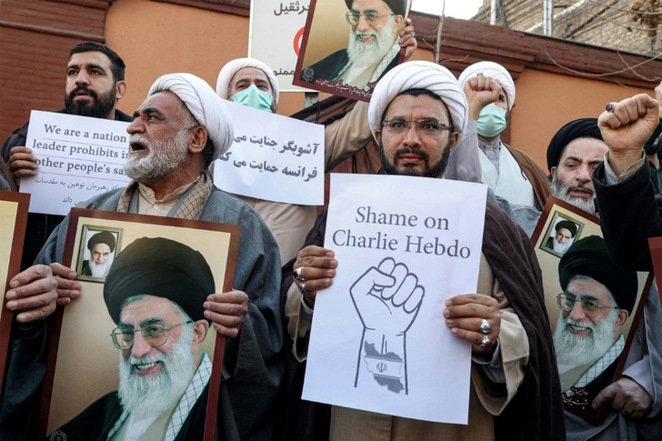 Waving Iranian flags, they held pictures of Khamenei and signs reading "I will sacrifice my life for the leader", and "Shame on Charlie Hebdo".