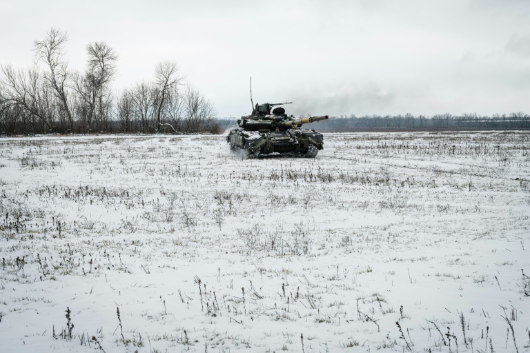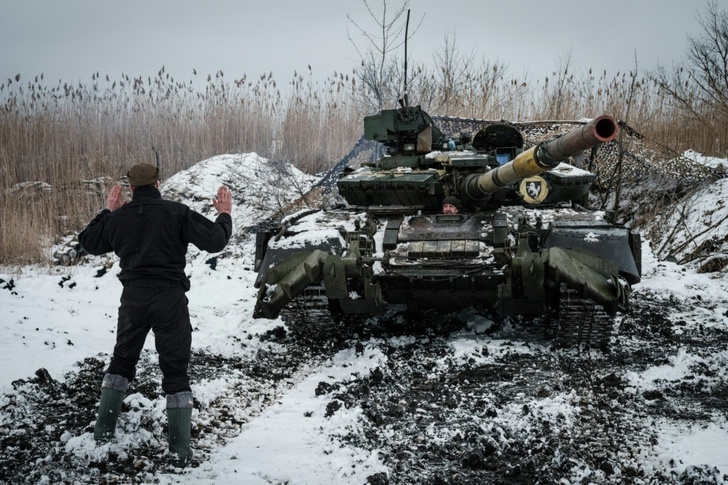 In the frozen fields of the eastern Donbas region of Ukraine, a T-64 tank emerges ominously from its hiding place under camouflage netting, churning the snow into mud under its tracks.