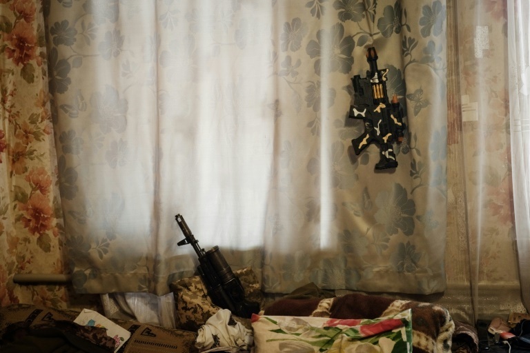 "Tikhiy", 37, has a few Christmas tree decorations and children's toys stuffed in his pockets for luck on the battlefield.