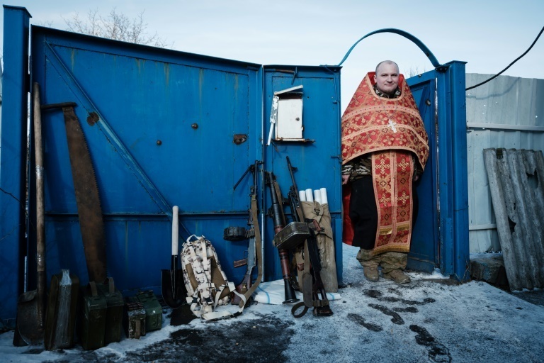 But "Father Mykola" doesn't carry a machine gun: his only protection is a large three-barred silver cross hanging from a heavy chain around his neck.