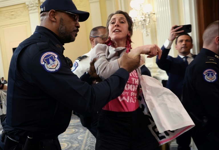 As she was removed, a second protester stood up and yelled, "This committee is about saber-rattling -- it's not about peace," and continued to rant as he too was escorted out amid a chorus of boos from the gallery.