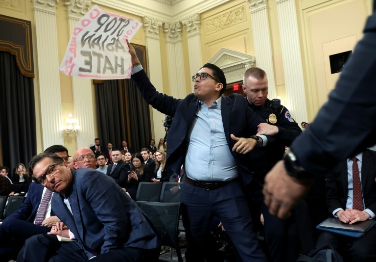 A panel of US lawmakers tasked with scrutinizing Beijing held a debut hearing Tuesday overshadowed by protests from the public gallery as it focused on the "threat" of the ruling Chinese Communist Party.