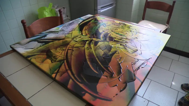 Pierre-Paul Marchini's apartment in Ajaccio is overflowing with his artwork. From the walls to the corridors, the space is entirely inhabited by his dozens of colorful paintings. And as a studio, the artist has chosen his kitchen. An atypical place indeed, but one that allows him to paint according to inspiration and desire, rather than obligation. A painting in movement, horizontal, made with oil and knife, in which the artist expresses the depths of his soul. Pierre-Paul Marchini builds his works at the moment, letting his imagination guide him.
