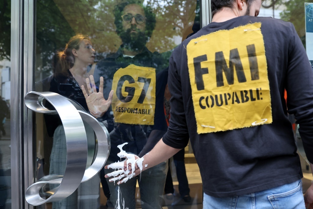 The group spread a banner reading "G7 responsible, IMF guilty" in front of the building, while some activists scattered fake banknotes marked with the slogan "Stop fossil fuels".