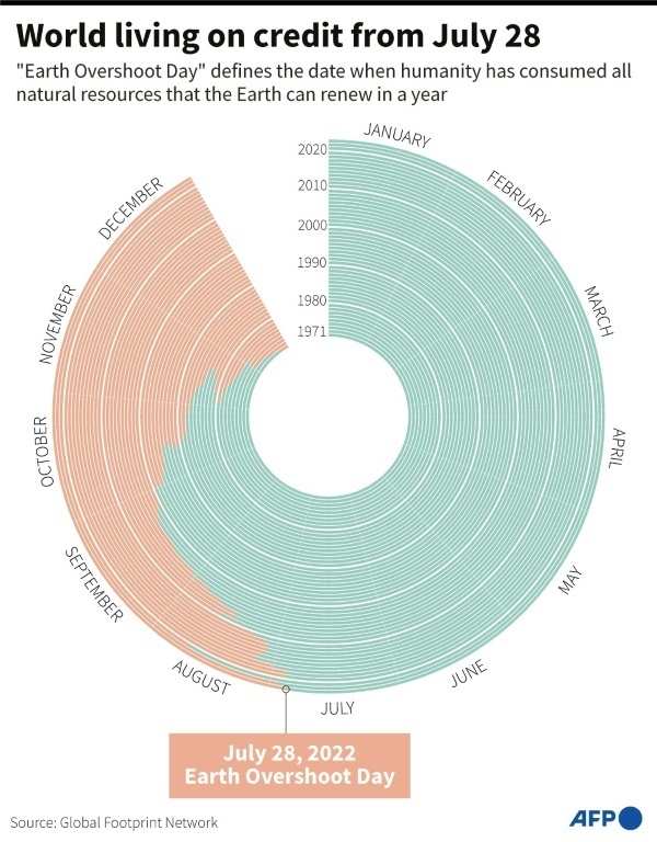 Mankind marks a dubious milestone Thursday, the day by which humanity has consumed all earth can sustainably produce for this year, with NGOS warning the rest of 2022 will be lived in resource deficit.