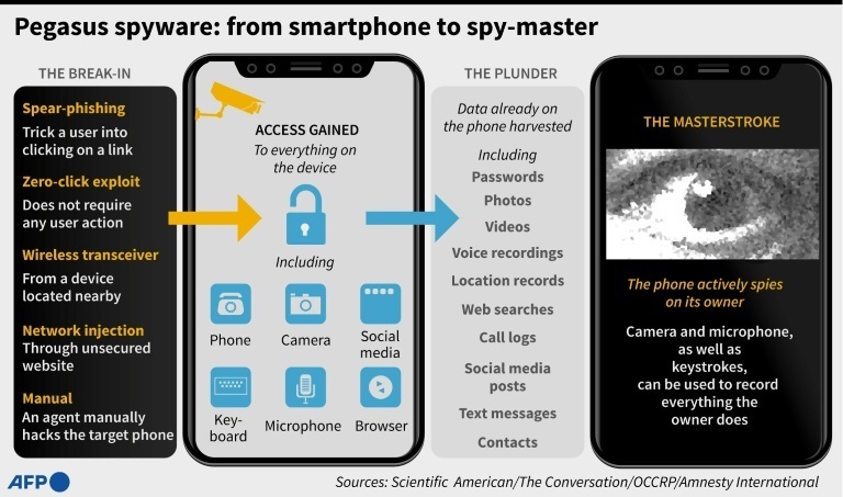 The spyware infiltrates mobile phones to extract data or to activate a camera or microphone to spy on their owners.