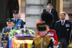 Twenty-five years after capturing the hearts of the world when they walked behind their mother Diana's coffin, princes William and Harry on Wednesday again helped lead the most poignant of processions.. Next to William and Harry was their cousin, Anne's son Peter Phillips.