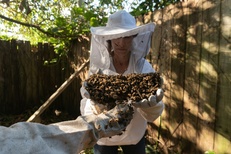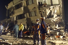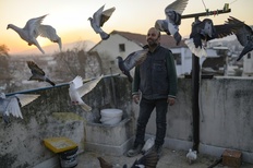 Murat Guzel scatters bird feed on the roof as the sun sets over the Antakya restaurant at which he used to work before the earthquake that destroyed the southern Turkish city.. Birds, mostly pigeons, some motley and scruffy, others pristine and plump, scrabble for the feed as Guzel, 40, calls to them.