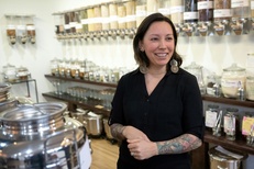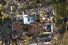 A brick house reduced to rubble, its floors strewn with personal effects like a pink backpack and a bottle of shampoo, somehow standing upright.. Her house was flattened by the storm, which blew away the walls and roof, leaving only the wood floor, a chest of drawers, a bathtub flipped onto one side and some personal possessions tossed here and there.