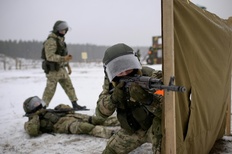 In Moscow-allied Belarus, officers look out across a snowy training ground outside the capital Minsk as Russian and Soviet-era tanks fire into the distance.. Painted in white camouflage, a brand new Russian BTR-82A tank and a modernised Soviet tank send echoes booming around the field as they shoot.