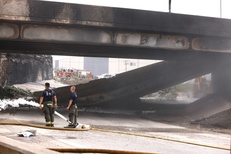 A section of one of America's busiest highways, which collapsed some two weeks ago after a fire, reopened Friday, officials said.. An overpass on Interstate 95 in Philadelphia collapsed on June 11 after a tanker crossing underneath burst into flames.
